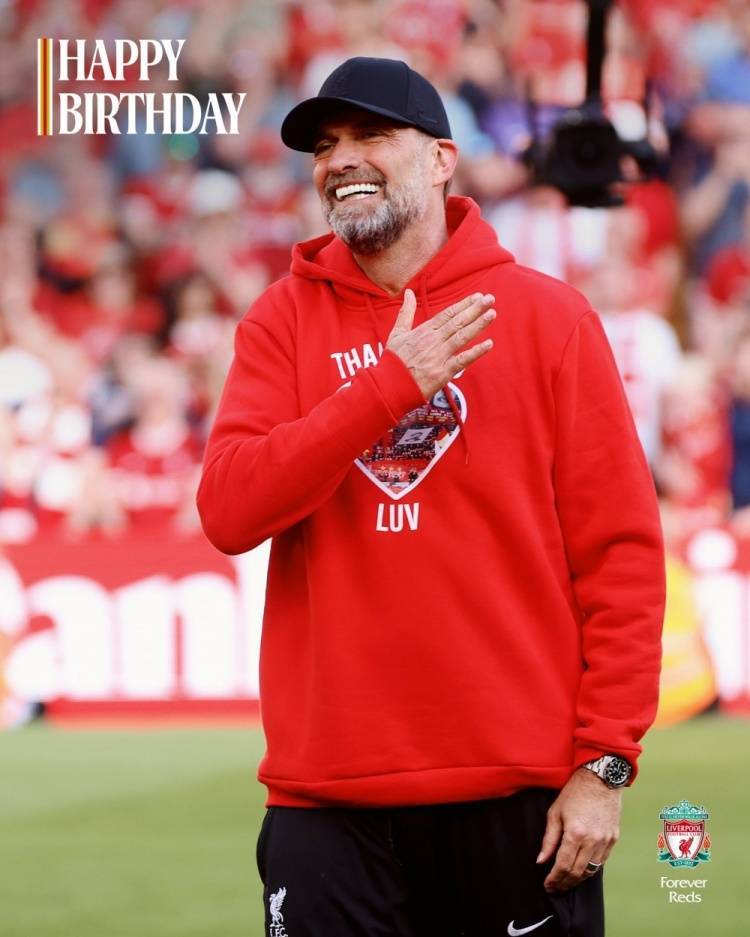 利物浦官方社媒晒出为克洛普制作的生日海报,配文:“生日快乐,尤尔根!”